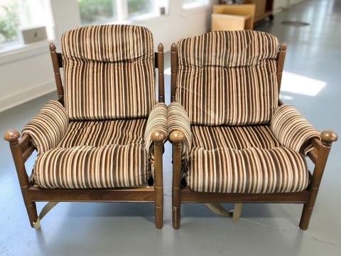 A pair of 20th century Guy Rogers armchairs from the Santa Fe range, in striped upholstery, width 77 cm.