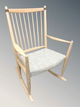 A 20th century Danish rocking chair in the style of Hans J Wegner, labelled beneath N. Eilersen, in bleached oak finish, width 65 cm.