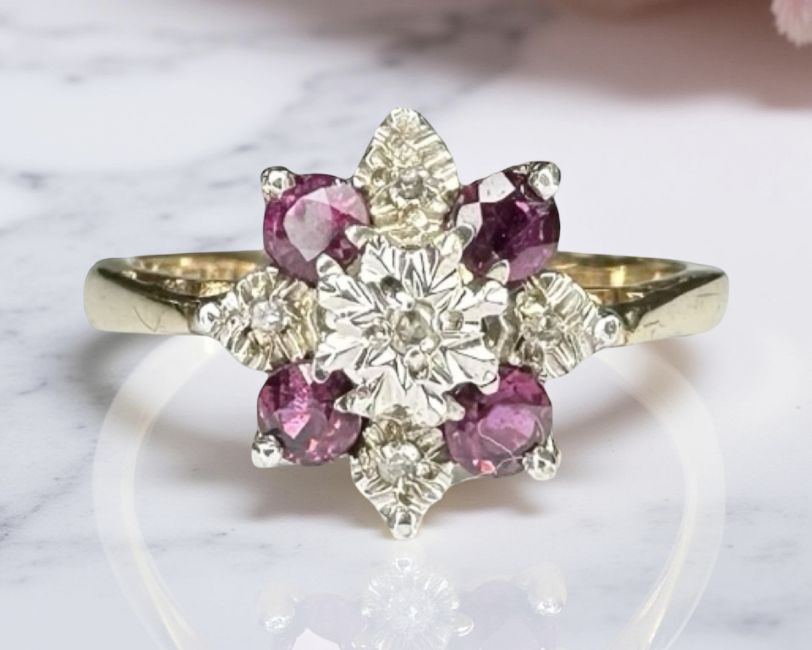 A 9ct yellow gold synthetic ruby cluster ring, size O.