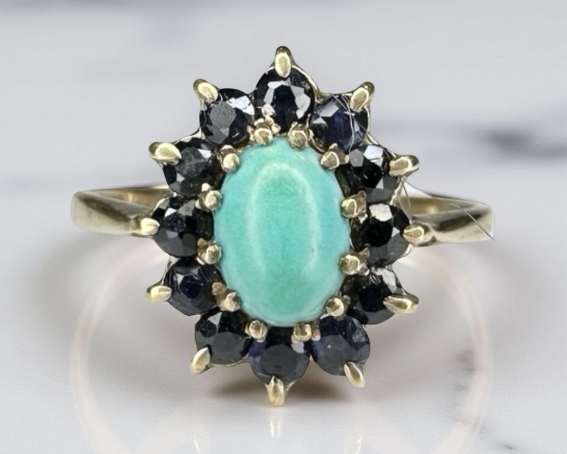 A 9ct yellow gold turquoise cluster ring, size N/O.