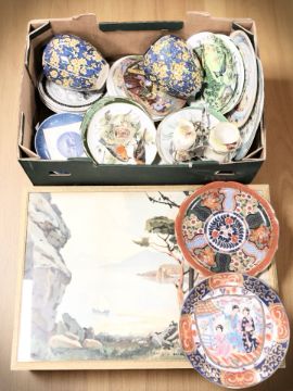 Assorted collectors plates, Japanese export plates, pair of Royal Doulton vases pattern D1365, framed print, etc. (1 box)