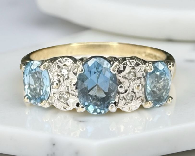 A 9ct yellow gold synthetic blue stone dressing ring, size N.