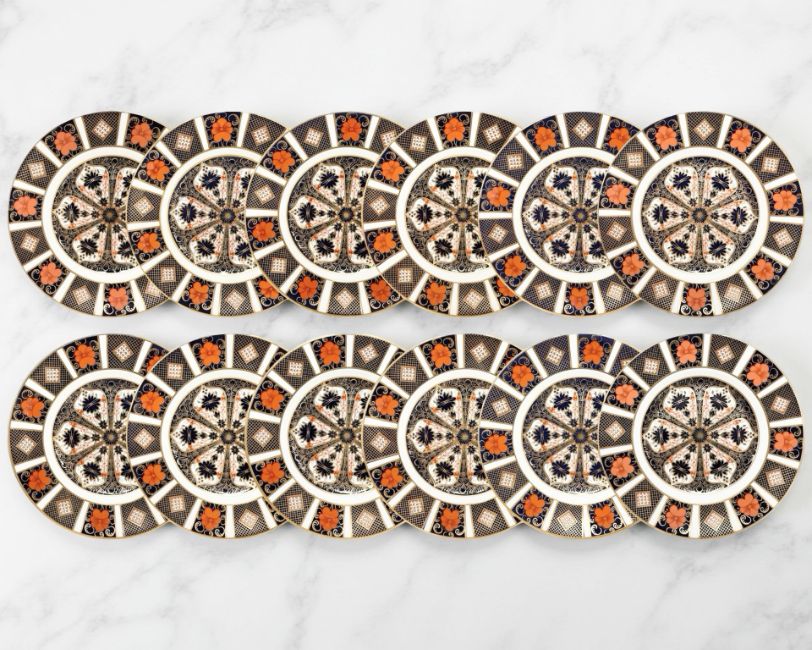 A set of twelve Royal Crown Derby Imari porcelain dessert plates, pattern 1128, with unfilled gold band border, diameter 22 cm, various date codes, all first quality. (12)