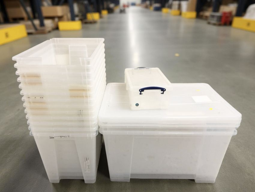 A quantity of plastic storage boxes with lids, the largest 80 cm wide.