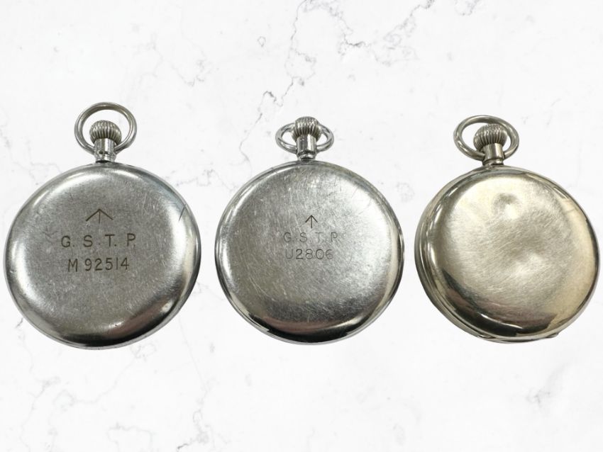 Two mid 20th century chrome pocket watches with British military markings to back by Leonidas and Cyma, together with a further 'Everite' pocket watch by H Samuel. (3)