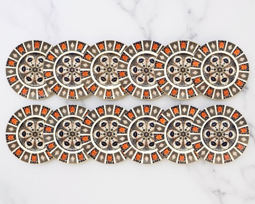 A set of twelve Royal Crown Derby Imari porcelain dinner plates, pattern 1128, seven of which are Old Imari, with unfilled gold band border, diameter 27 cm, various date codes, all but one first quality. (12)