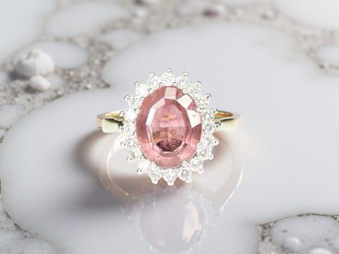 An 18ct yellow gold pale pink sapphire and diamond cluster ring, size M/N