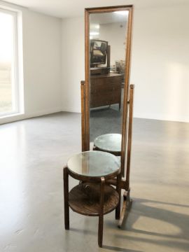 An oak cheval mirror and a mirrored top circular occasional table.