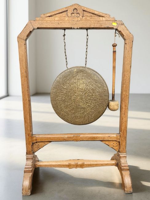 A late Victorian oak dinner gong, with beater, height 114 cm.