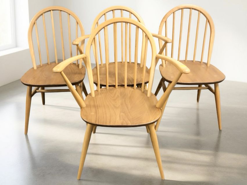 A pair of Ercol light elm spindleback armchairs, width 62 cm, and a further similar pair of single chairs. (4)