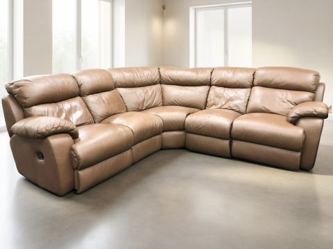 A contemporary stitched brown leather manual reclining corner suite, length from corner to one end 270 cm.