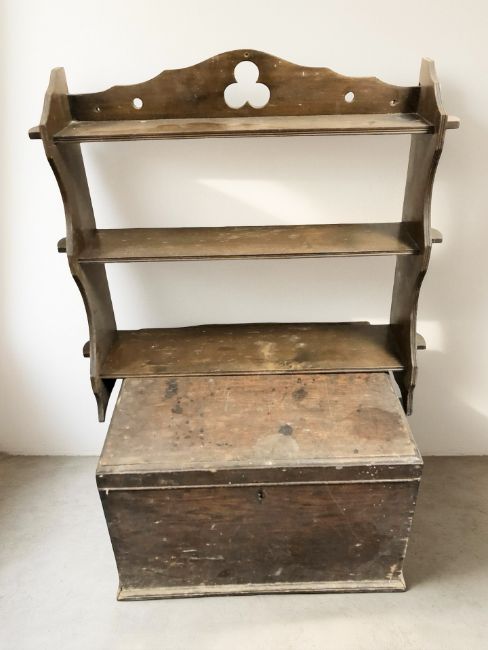 A beech wall shelf and a 19th century oak chest, width 49 cm.