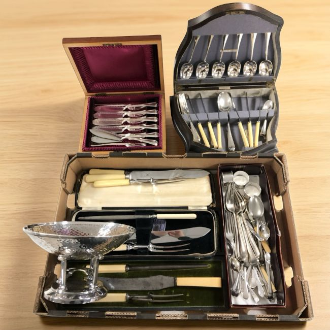 Several canteens of cutlery, a hammered EPNS pedestal fruit bowl, etc. (1 box)