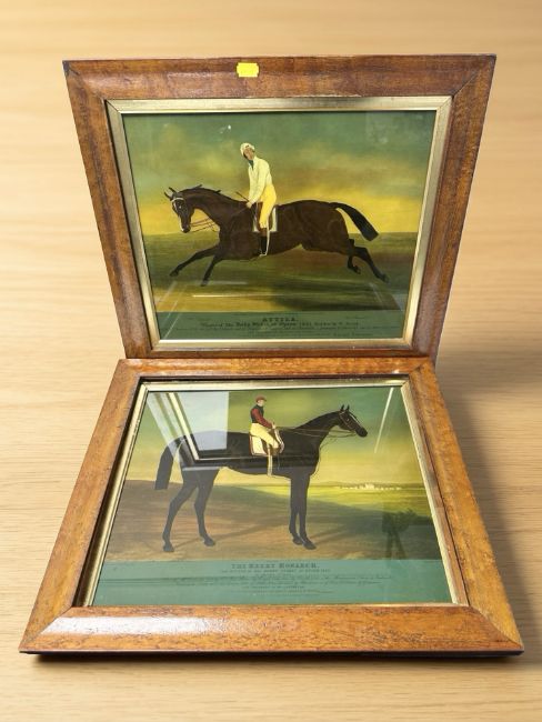A pair of reproduction Georgian-style reverse paintings on glass depicting jockeys on horseback titled 'Attila and 'The Merry Monarch', in maple frames, each 44 cm x 50 cm overall.