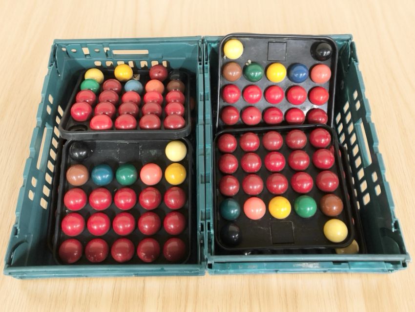 A plastic bin containing a large quantity of snooker cues, some with metal cases, and two crates containing snooker balls.