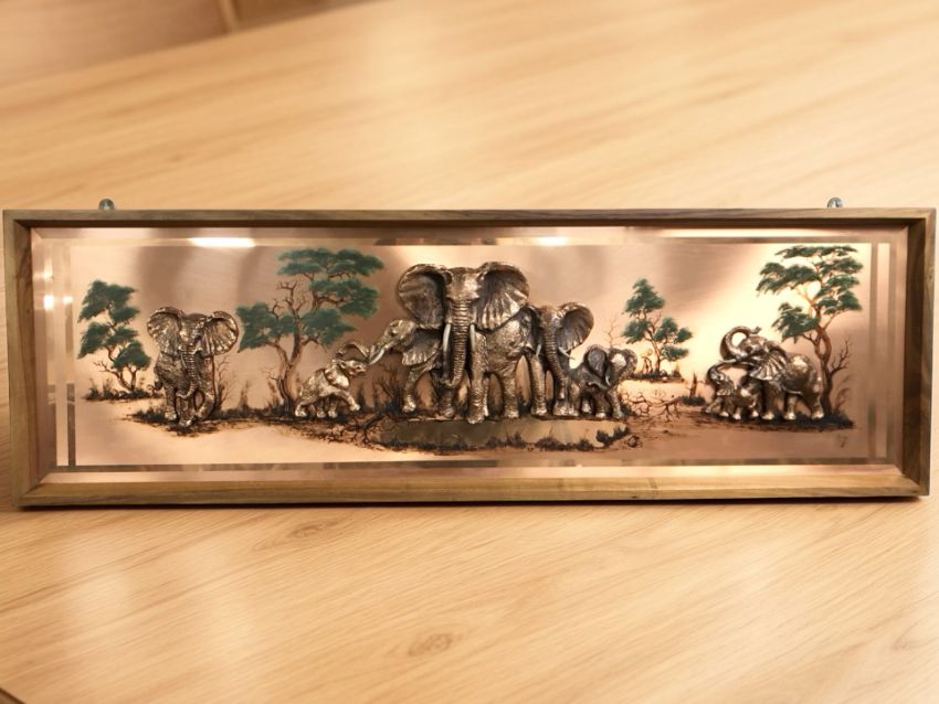 A large copper finish rectangular panel in wooden frame depicting elephants, overall 157 cm x 50 cm.