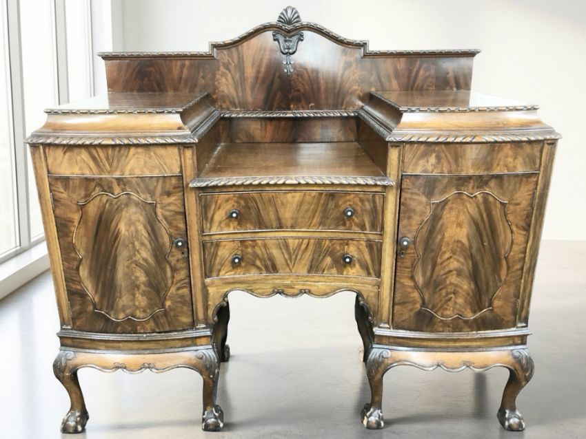A late Victorian mahogany twin pedestal sunk centre sideboard on claw and ball feet, 156 cm x 63 cm x 133 cm.