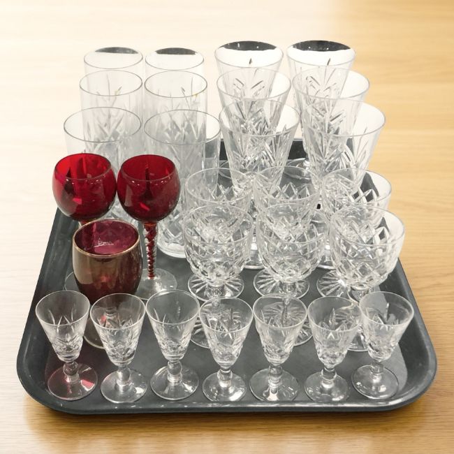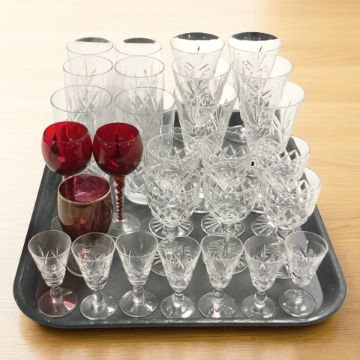 A set of six Edinburgh Crystal wine glasses and various other drinking glasses.