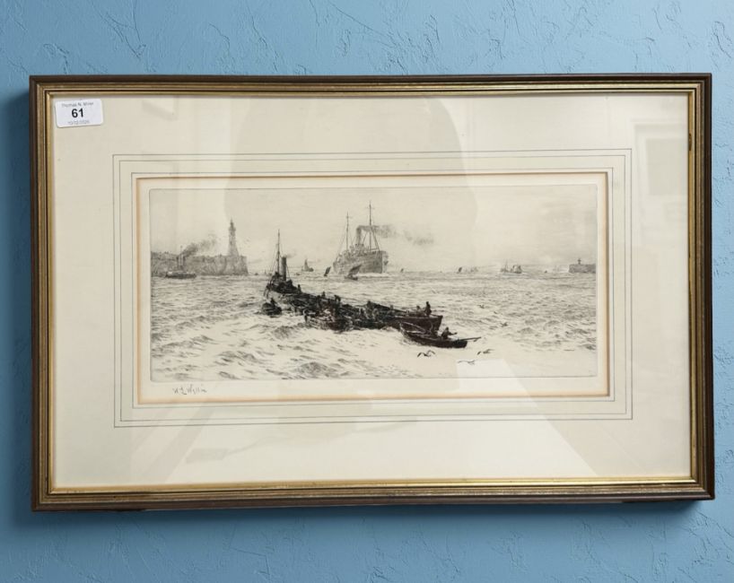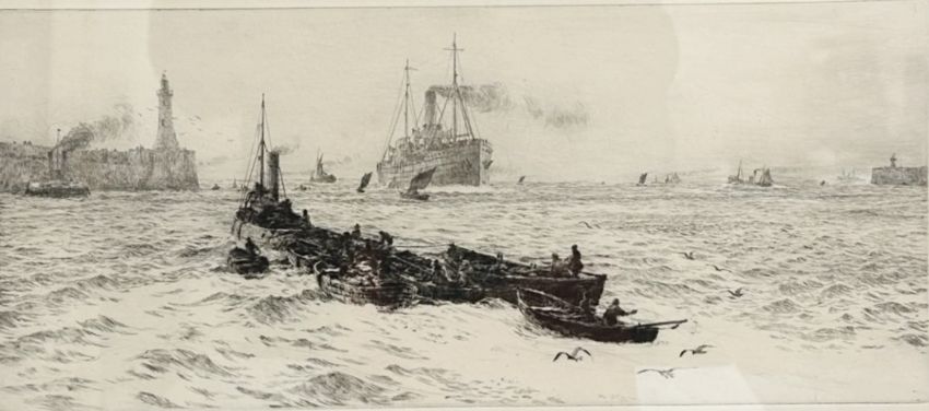 William Lionel Wyllie (1851-1931) : The Mouth of The Tyne, drypoint etching, signed in pencil to bottom left, with full margins, 16 cm x 38 cm, framed.