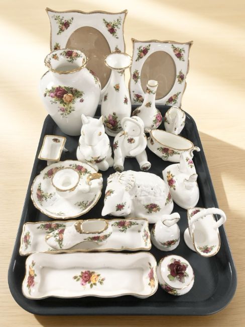 A collection of Royal Albert Old Country Roses cabinet porcelain including pair of photo frames, vases, figurines, etc.