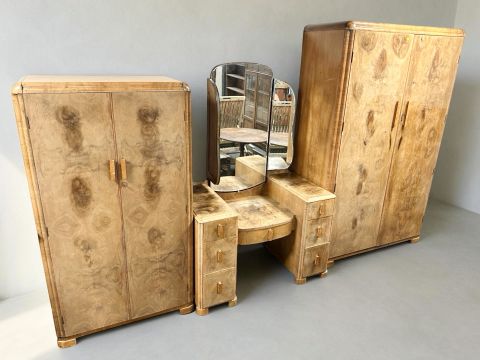 An Art Deco figured walnut three piece bedroom suite comprising of double door wardrobe, smaller compactum wardrobe and mirror-back sunk centre dressing chest.