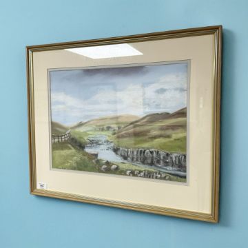 June Colvin : A river running through moorland, pastel drawing, 44 cm x 32 cm.