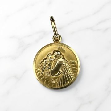 A gold religious disc pendant, stamped 750, diameter 13mm