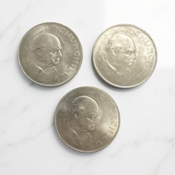 A gent's vintage gold-plated and stainless steel automatic centre seconds wristwatch, signed Omega, Genève, the silvered dial with baton numerals, T Swiss Made Y beneath 6 o' clock, Omega crown, screw-off case back with inscription dated 1971, calibre 552 automatic 24 jewel movement numbered 28,664,181, on brown leather strap with Omega buckle, case 33mm. Together with three Churchill crowns.