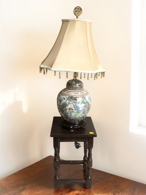 A small oak occasional table, height 43 cm, and a modern Chinese famille rose table lamp.