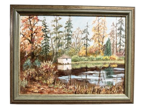 June Colvin : Boathouse by a lake, oil on canvas, 40 cm x 30 cm.