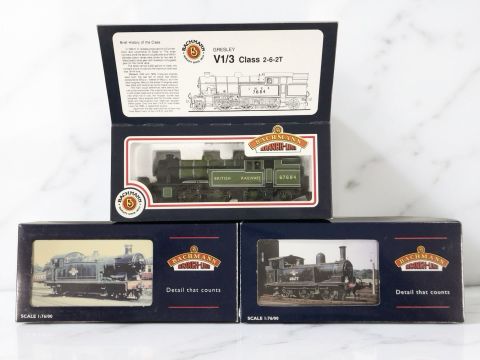 Three Bachmann Branchline boxed scale locomotives : 31-607 V3 Tank 67684 Doncaster green British Railways (Hopper type bunker), 32-079 class 56XX Tank 6624 BR black, and 31-055 J72 Tank BR lined green early emblem 68680.