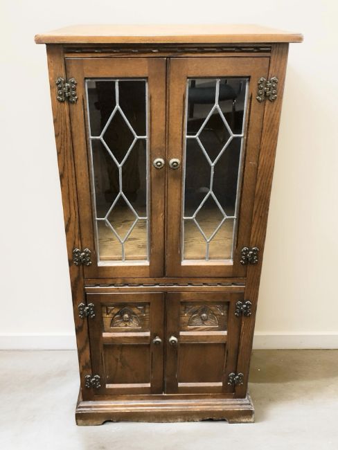 A reproduction oak and leaded glass double door side cabinet, 55 cm x 50 cm x 115 cm.