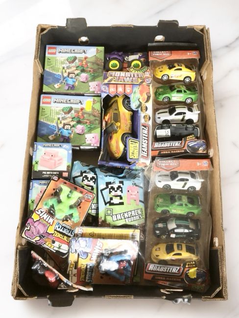 Two LEGO Minecraft sets, die cast cars and other modern toys. (1 box)