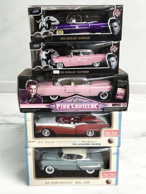 Two Sun Star 1/18 scale die cast vehicles, 57 Ford and 53 Chevrolet, an MRC Elvis Presley's pink Cadillac 1955 car, and two Jada Elvis Presley cars 1955 Cadillac Fleetwood and 1956 Cadillac Eldorado.