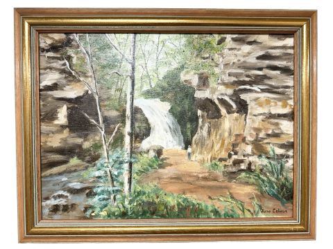 June Colvin : Figure by a waterfall, oil on canvas, 39 cm x 28 cm.