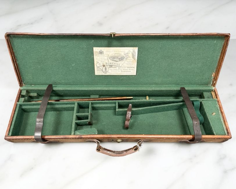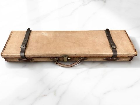 An antique C G Bonehill Ltd canvas shotgun case, lined in green baize and containing a cleaning rod