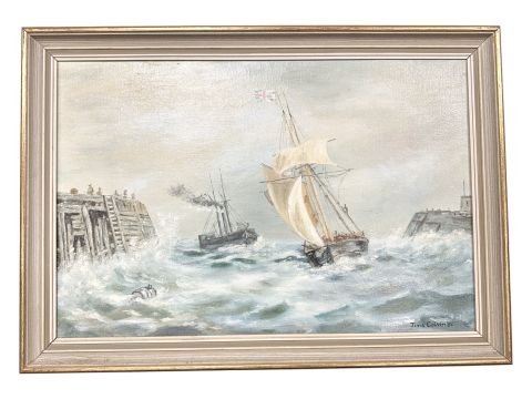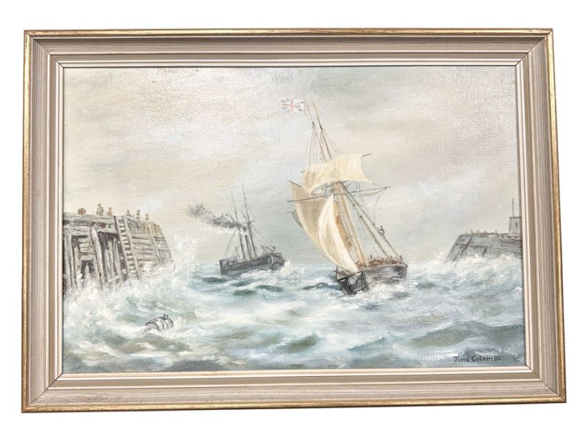 June Colvin : Boats in rough seas, oil on canvas, 45 cm x 30 cm.