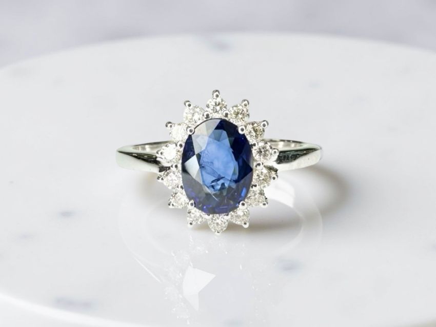 An 18ct white gold sapphire and diamond cluster ring, size N.