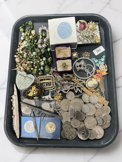 A collection of crowns, fifty pence pieces, various costume jewellery, small die cast model ships, etc.