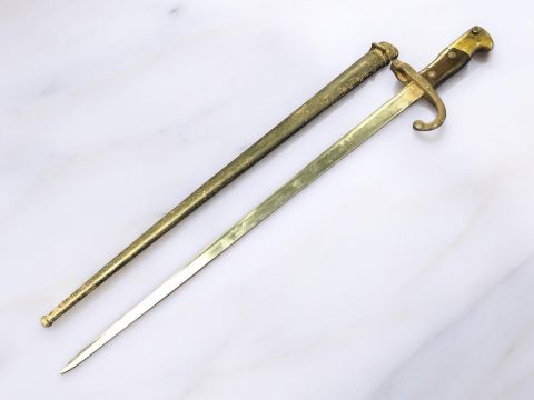 A French Epee bayonet dated 1879, in black painted metal scabbard.