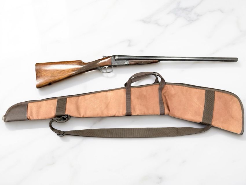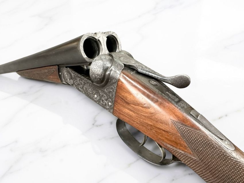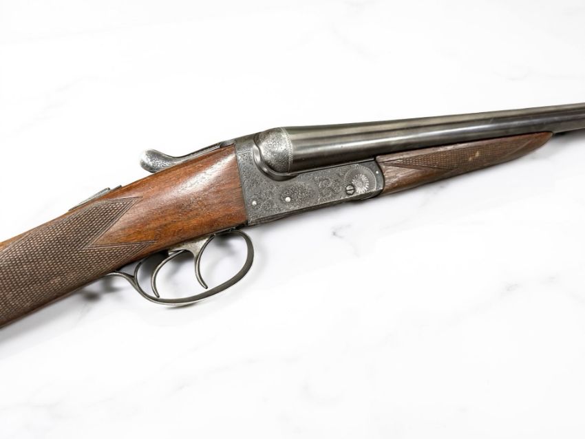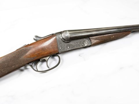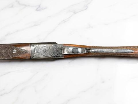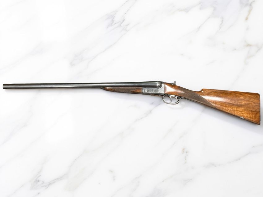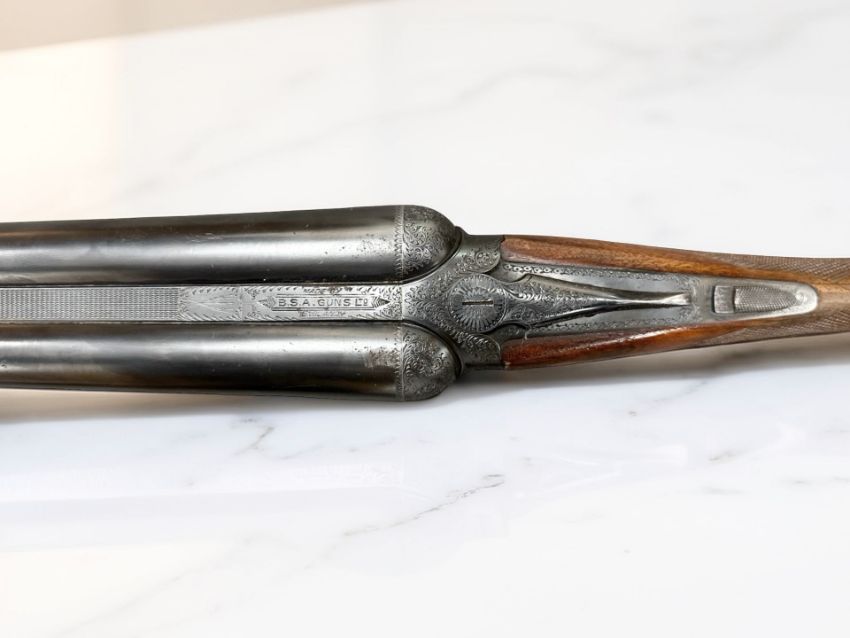 A BSA double-barrelled 12 bore ejector shotgun, serial number 50711, the walnut half stock with chequered grip, two triggers, thumb safety, foliate engraved lock plate, the 25" blued-steel barrels with engine turned central rib with maker's name BSA Guns Ltd, England, with canvas gun slip. *** A valid UK Section 2 Shotgun Certificate is required to bid on and complete purchase of this lot.