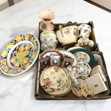 Assorted ceramics including Spode, Fruithaven dinner plates, twin handled planter, a large charger decorated with fruit, figures, etc. (2 boxes)
