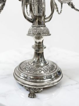 A large and impressive silver-plate and cut-crystal eight-branch table epergne/centre piece, manufactured by Osborne Silversmiths, Sheffield, the central knopped stem with chased floral decoration, supporting a large central bowl surrounded by eight S-curve arms terminating in stepped sockets, in which sits a matching smaller bowl, the circular base raised on three lion's paw feet, 47 cm H x 57 cm W.