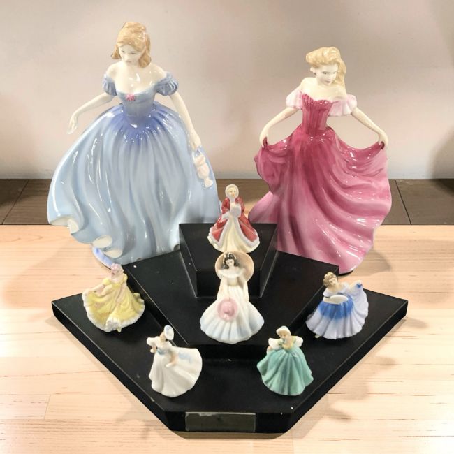 Two Royal Doulton figures 'Emma' HN3714 and 'Melissa' HN3977, together with six further miniature ladies on plinth, all with boxes.