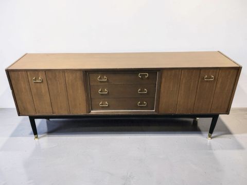 A 20th century G-Plan teak and ebonised low sideboard designed by E Gomme, 191 cm x 44 cm x 77 cm.