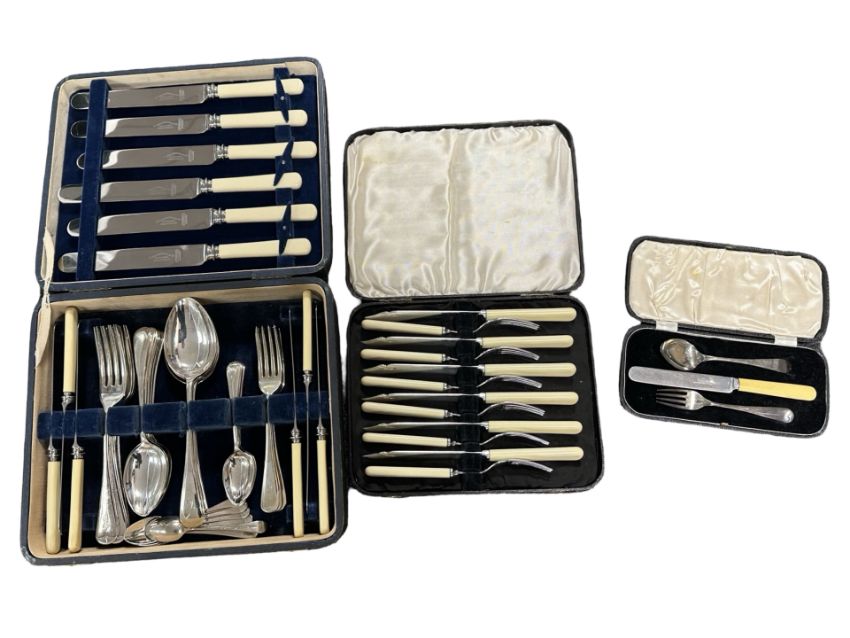 A canteen of Sheffield stainless steel table cutlery, a further canteen, and a cased silver fork and spoon (3)