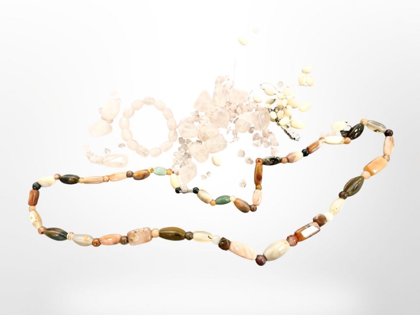 A hardstone necklace, pink quartz items etc (a/f)