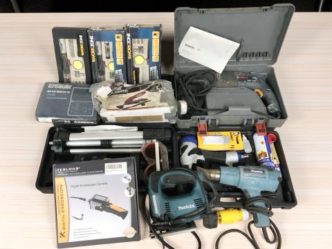 A collection of power tools and hardware including Bosch, Erbauer, Roberts, etc. (2 boxes)