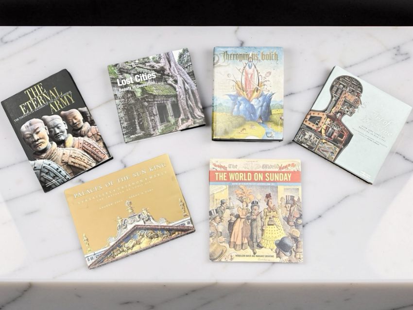 Six assorted books relating to art, architecture and history : 'Hieronymus Bosch : The Complete Works', publisher Taschen, 'The Eternal Army : The Terracotta Soldiers of the First Emperor', publisher White Star, 'The Art of Medicine', publisher Ilex, 'The World on Sunday', publisher Bullfinch Press, 'Lost Cities' by Julian Beecroft, publisher Flame Tree, and 'Palaces of the Sun King', publisher Laurence King. (6)