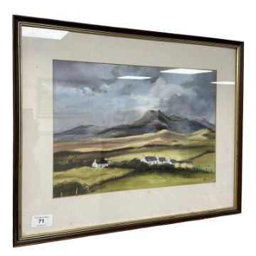 June Colvin : Farm cottages on a hillside, colour chalk, signed, 38 cm x 26 cm.